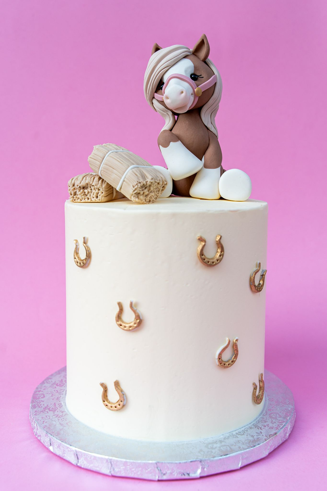 Nietuzinkowe wzory tortów dla dzieci. Kolejny wzór to HORSE czyli konik, sianko i podkówki. Tort idealny dla miłośników jazdy konnej.